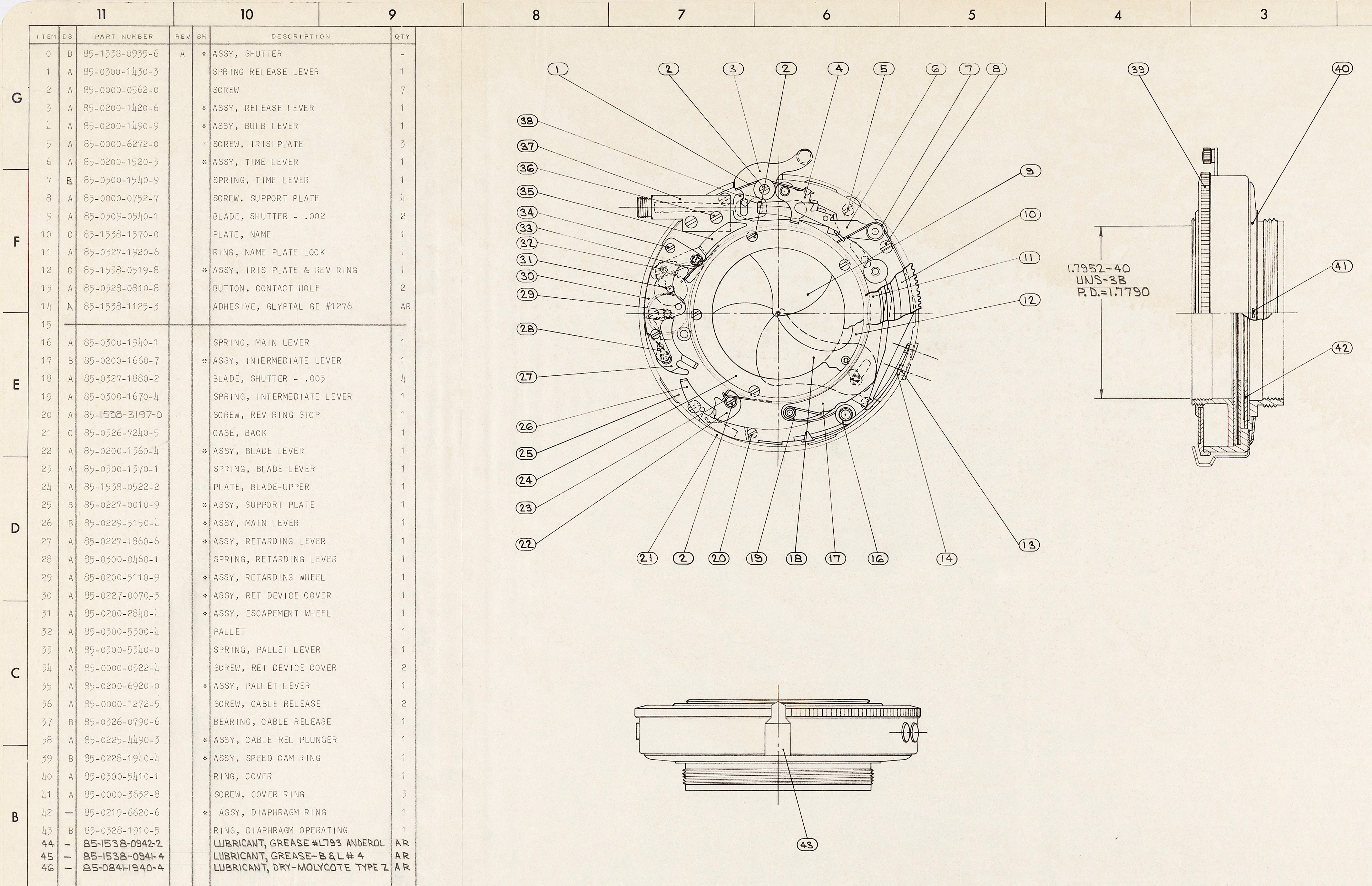 The service experience is better for all parties if we’re on the same page. Although Alphax and Betax shutter layout and parts vary from model to model, the below Wollensak factory diagram of an Alphax #3 shutter is a good reference point. If the print is too small to read, you can view the full resolution file here.