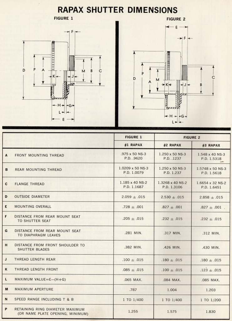 | Shutter Size | Max. Diaphragm (mm) | Lens Mount Thread (in x tpi) | Flange Mount Thread (in x tpi) | Overall Thickness (mm) | Cable release thrust required (in) |